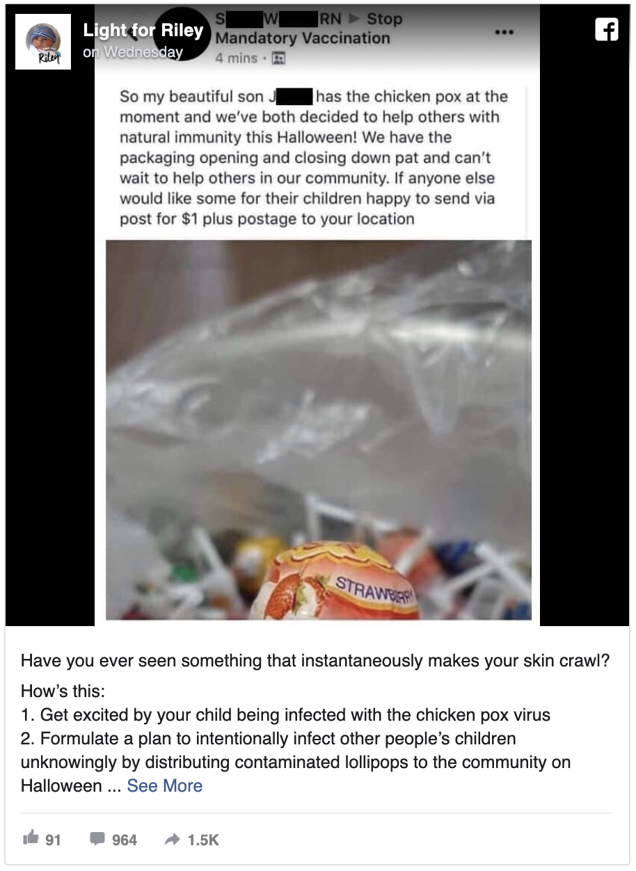 Posting in a private Facebook group “Stop Mandatory Vaccination,” Sarah Walker claimed that her son had recently come down with the pox. She said, tainting Halloween candy would help give the kids chicken pox, making them immune for life, according to a Australia’s popular news site news.com.au.